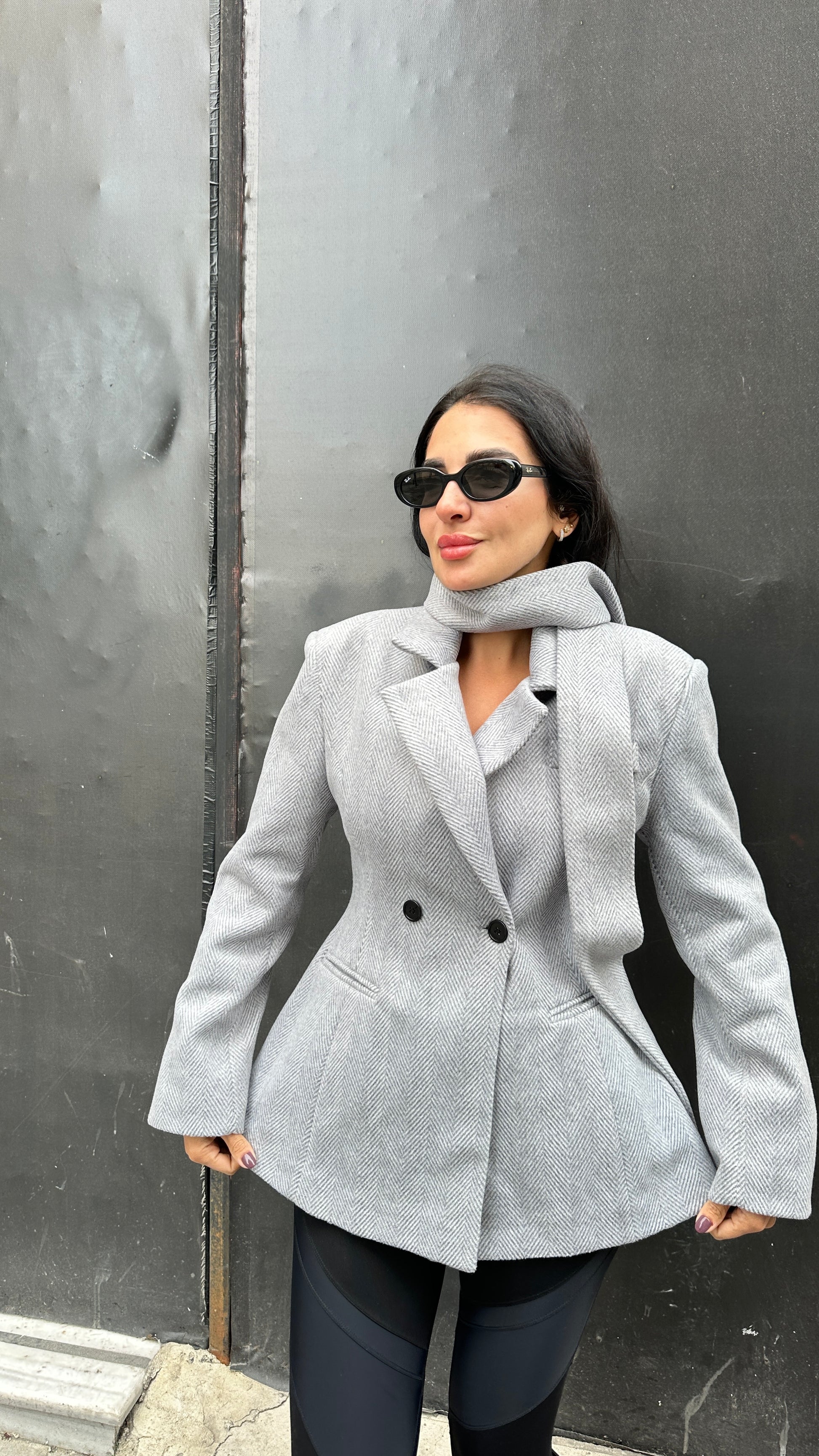 Blazer, Double-breasted, Flared Hem, Detachable Scarf - Light Grey -Felt Fabric